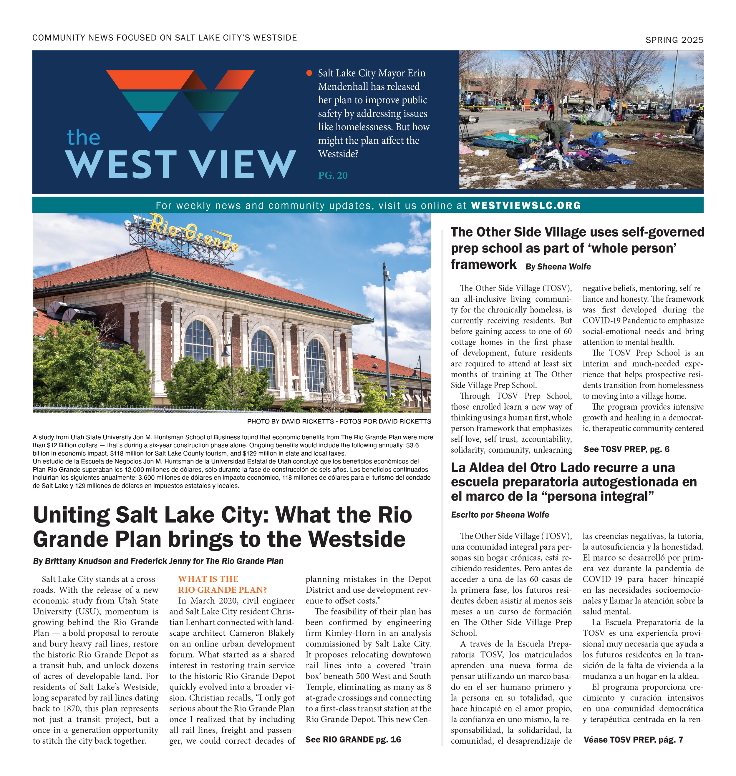 < Back to All Issues Spring 2025 Download Issue Request a Copy Articles Sheena Wolfe The Other Side Village uses self-governed prep school as part of ‘whole person’ framework Sheena Wolfe Sheena Wolfe Jacobo Rueda Mental health services are here, but Westside residents still face barriers Jacobo Rueda Jacobo Rueda Sheena Wolfe Realignment of the Jordan River Trail, which is included in the Backman Community Open Space Project, is now underway Sheena Wolfe Sheena Wolfe Andy Cupp From the editor… Spring 2025 Andy Cupp Andy Cupp Meisei Gonzalez Project Aims to Improve Air Quality and Transportation Access for Utah’s Aging Communities Meisei Gonzalez Meisei Gonzalez Julee Laurent for Neighborhood House Celebrating Every Star: Inclusive Prom Lights Up Salt Lake City Julee Laurent for Neighborhood House Julee Laurent for Neighborhood House Miles Ellis Nico’s: A cozy, comfort-filled Mexican spot in Fairpark Miles Ellis Miles Ellis Staff Report Community Spotlight: Spring 2025 Staff Report Staff Report The Rio Grande Plan Uniting Salt Lake City: What the Rio Grande Plan brings to the Westside The Rio Grande Plan The Rio Grande Plan Sheena Wolfe The Other Side Donuts to celebrate one-year anniversary on June 28th Sheena Wolfe Sheena Wolfe Angie Toone Salt Lake City Mayor’s Office releases new public safety plan: Here’s what that could mean for the Westside Angie Toone Angie Toone Estefania De Lucas Salt Lake County becomes Utah’s first ‘age-friendly community’ Estefania De Lucas Estefania De Lucas Andy Cupp UTA, Salt Lake City improving public transportation with high-frequency “Go Routes” Andy Cupp Andy Cupp Estefania De Lucas Spring into Summer: Local events and happenings on the Westside Estefania De Lucas Estefania De Lucas Andy Cupp Grant program to improve business facades open for applications Andy Cupp Andy Cupp Miles Ellis Los Tapatios: A birria lover’s paradise in Fairpark Miles Ellis Miles Ellis Sheena Wolfe Construction begins on the 600/700 North Corridor after 5 years of planning Sheena Wolfe Sheena Wolfe Staff Report myHometown SLC: What do they do? Who do they help? How can you get involved? Staff Report Staff Report Sheena Wolfe South Salt Lake to hold annual Mural Fest Sheena Wolfe Sheena Wolfe Staff Report SEG Foundation delivers direct impact to Westside neighborhoods as All In On Utah campaign reaches thousands Staff Report Staff Report Estefania De Lucas Utah Naloxone hits milestone in reported opioid overdoses Estefania De Lucas Estefania De Lucas Andy Cupp Play ball! Rose Park Baseball kicks off 70th season of sports and community on the Westside Andy Cupp Andy Cupp Miles Ellis All Chay: Vibrant vegan Vietnamese in Fairpark Miles Ellis Miles Ellis Sheena Wolfe myHometown hosts service projects throughout the year to clean up Westside neighborhoods Sheena Wolfe Sheena Wolfe Andy Cupp Transportation officials to hold open house ahead of 600/700 North reconstruction Andy Cupp Andy Cupp